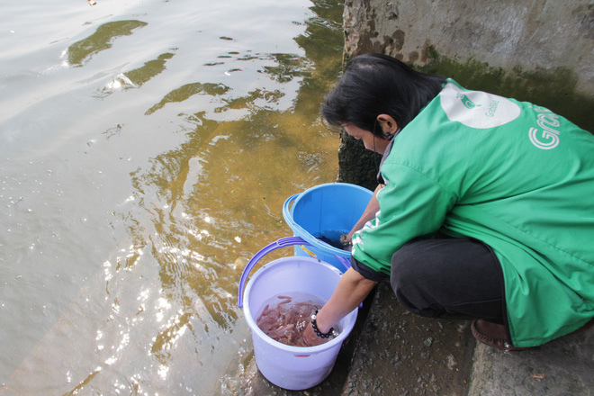 | Tài xế xe ôm công nghệ cũng mua cá ra bờ sông phóng sinh, mong năm mới nhiều may mắn. |