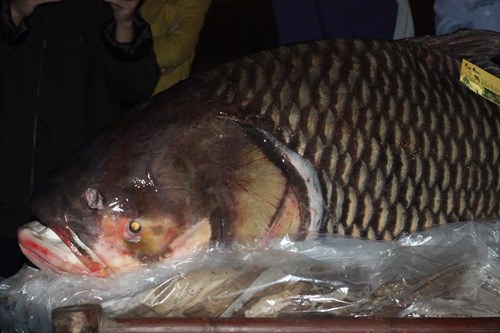 Trước đó, trưa ngày 11/1, nhà hàng của anh Thái cũng đã “rước” một con cá hô được đánh bắt từ sông Mê Kông (Campuchia) về bằng đường hàng không. Con cá hô đỏ có trọng lượng 72kg, dài gần 1,6 mét.