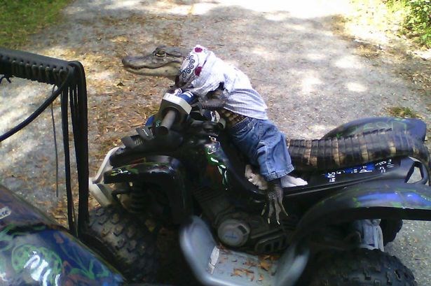 | Hình ảnh chú cá sấu đang ngồi trên chiếc xe đạp điện. Ảnh: Telegraph |