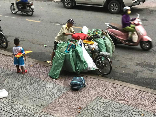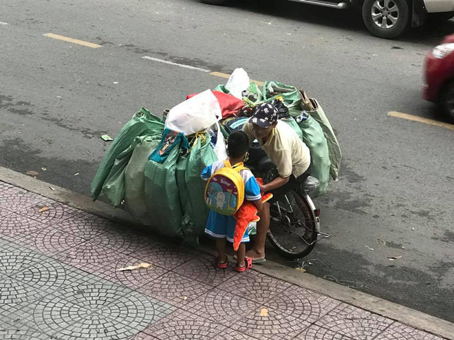 Kèm theo những dòng chia sẻ trên, là hình ảnh người mẹ trong bộ quần áo nam giới, đội chiếc mũ lưỡi trai đang tất tả chằng những chiếc bao đựng ve chai lên xe đạp, rồi nhanh chóng bế cậu bé đặt lên yên xe để bắt đầu một ngày lao động mới.