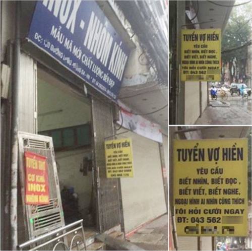 Vụ việc treo biển tuyển vợ của người đàn ông với mội dung: Tuyển vợ hiền, yêu cầu biết đọc, biết viết, biết nghe. Ngoại hình ai nhìn cũng thích. Tôi cưới hỏi ngay, kèm theo đó là số điện thoại và địa chỉ nhà đang khiến cộng đồng xôn xao những ngày gần đây. Người chồng tên là N.V.V. (sống tại đường Láng, quận Đống Đa, Hà Nội).
