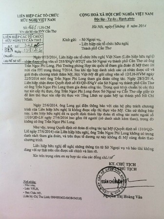 Cụ thể, Hội Liên hiệp các tổ chức hữu nghị Việt Nam (LHCTCHNVN) cho biết, ngày 7/3/2014 có nhận được công văn số 255/SNgV-HTQT của Sở Ngoại vụ TP.Cần Thơ về việc cử ông Trần Ngọc Phi Long tham gia đoàn đi Mỹ theo lời mời của FFI trong tháng 7/2014.
