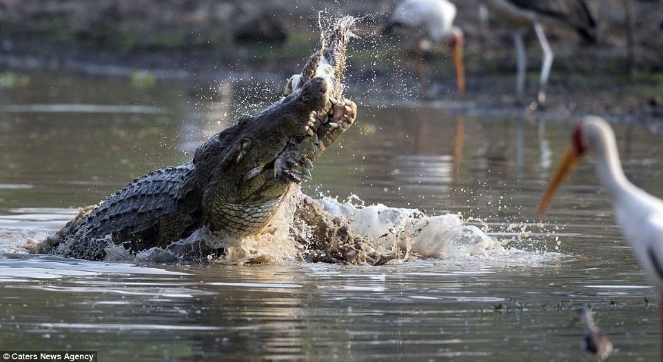Con cá sấu nhỏ bị đập mạnh xuống mặt hồ khiến nước bắn lên tung tóe trong khi có rất nhiều loài chim đang kiếm ăn ở quanh đó.