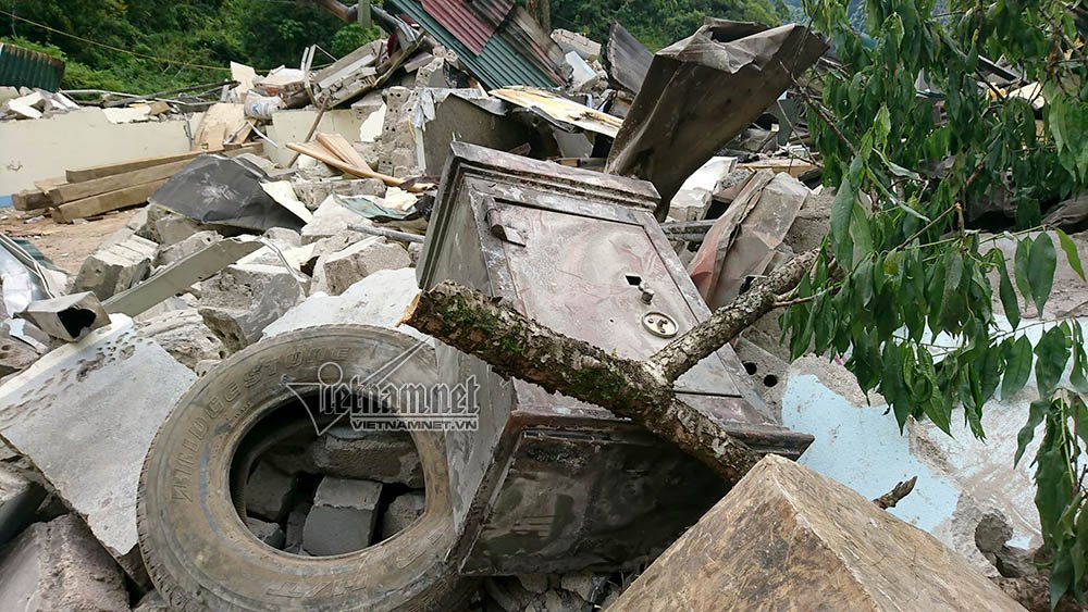 Bên trong đống đổ nát, chị Tráng Thị M. (ở bản Tà Dê) cùng nhiều người khác đang tranh thủ nhặt nhạnh vài món đồ có thể sử dụng còn sót lại.