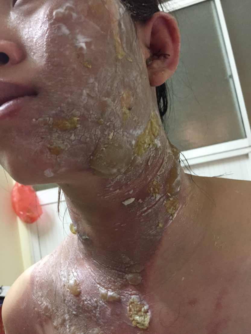 | Chị V. có bầu 5 tháng bị tạt nước sôi gây bỏng mặt, cổ, ngực. Ảnh: Thanh Niên |