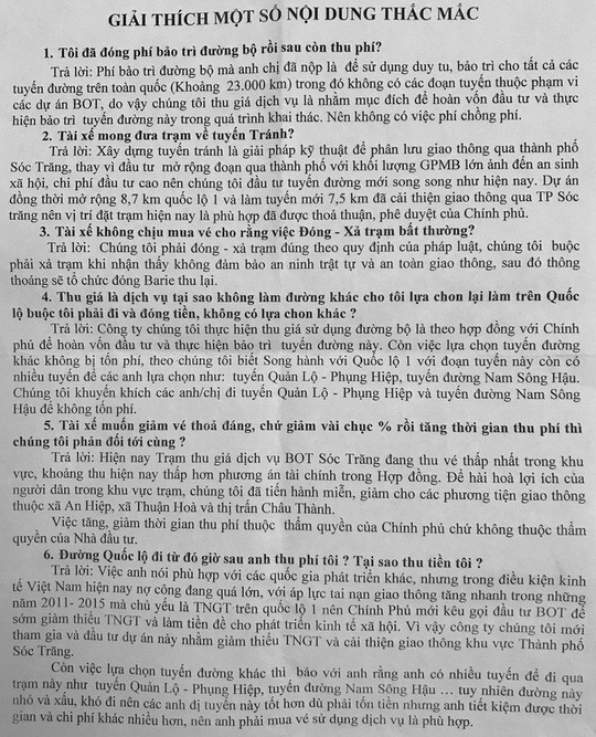 Ngoài ra, trong ngày 15/1, lãnh đạo BOT Sóc Trăng đã tổng hợp một số nội dung mà các tài xế hay dừng xe phản đối rồi đánh máy ra thành một "văn bản" để sẵn sàng giải thích cho những tài xế tiếp tục phản ứng.