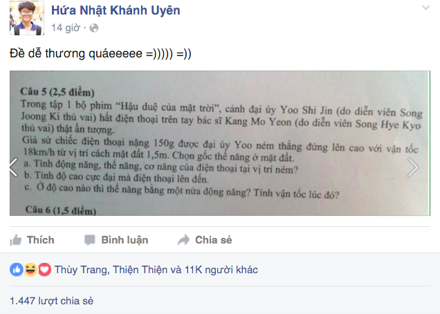 Mặc dù bộ phim "Hậu duệ mặt trời" đã kết thúc từ tuần trước, thế nhưng sức nóng của nó vẫn chưa có dấu hiệu có dấu hiệu giảm nhiệt. Sau khi hình ảnh chụp lại một đề thi Vật lý có nhắc đến bộ phim được chia sẻ trên mạng xã hội, Cộng đồng mạng lại thêm một nữa "phát cuồng".