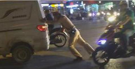 | Cảnh sát giao thông đẩy xe giúp tài xế. Ảnh cắt từ clip |