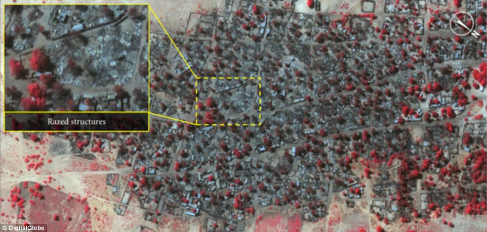 Ảnh chụp vào ngày 7/1, sau vụ thảm sát do phiến quân Boko Haram tiến hành cho thấy sự thay đổi của ngôi làng bởi sự phá hủy và số người thương vong.