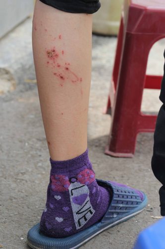 Vừa kể, chị Hòa vừa vén ống quần cho phóng viên xem vết bỏng ở chân và đám tóc cháy ở trên đầu.