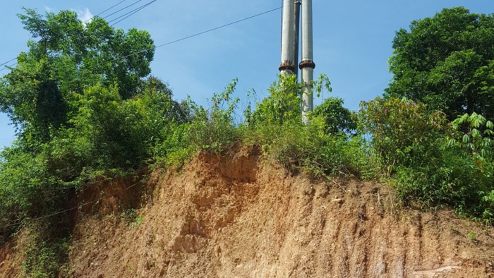 Hệ thống lưới điện các xã Thống Nhất, Vũ Oai, Hòa Bình đang có nguy cơ sạt chân móng gây đổ gãy do sạt lở.