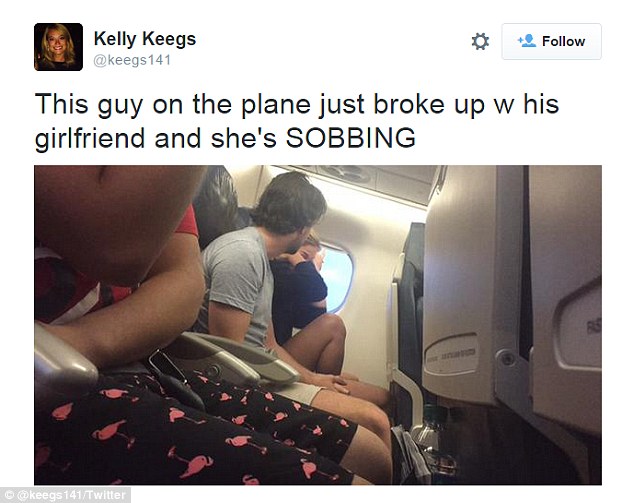 Dòng chia sẻ đầu tiền của Keeg thông báo có anh chàng trên máy bay vừa mới chia tay bạn gái, và cô ấy đang khóc, kèm theo đó là tấm ảnh chụp người đàn ông và cô gái tóc vàng đang che mặt.