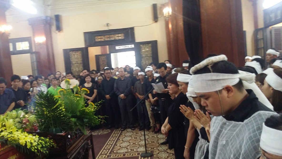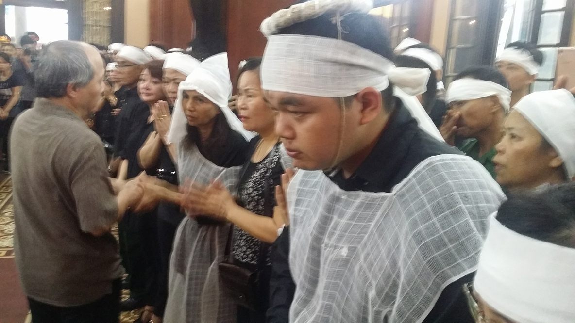 14h20: Vợ con nghệ sĩ Hán Văn Tình không ngừng khóc trước nỗi mất mát quá lớn, lặng lẽ đáp lễ các đoàn tới viếng