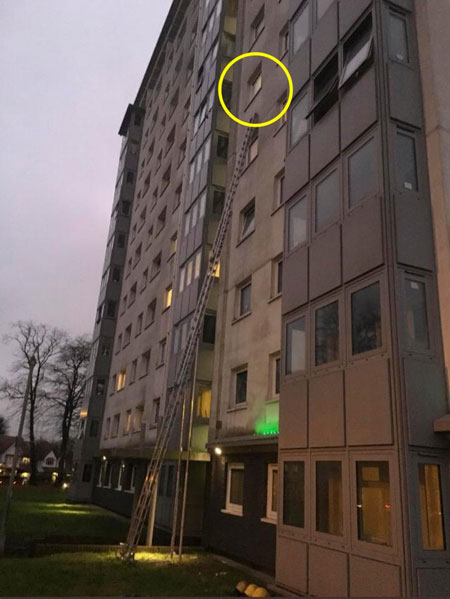 Tuy nhiên, chiếc thang vẫn không thể đến được cửa sổ. Vì vậy một người lính đã phải đứng ở những bậc trên cùng để cứu cậu bé.