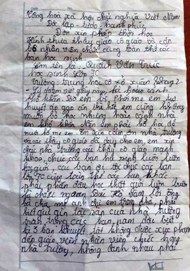 Lá đơn xin thôi học của nam sinh lớp 7 Quách Văn Trúc để đi kiếm tiền phụ giúp gia đình vì "nhà hết gạo", bố mẹ bệnh nặng khiến nhiều người không khỏi xót xa.