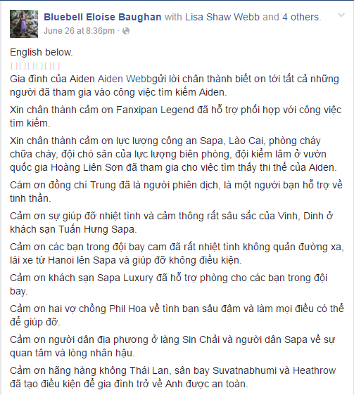 Trước đó, ngày 26/6, trên trang cá nhân của Bluebell Eloise Baughan, bạn gái phượt thủ người Anh tử nạn trong chuyến du lịch tại Fansipan, vườn quốc gia Hoàng Liên (gần Sa Pa, Việt Nam) đã có lời chia sẻ và cảm ơn đến Việt Nam bởi sự giúp đỡ trong việc tìm kiếm chàng trai Aiden Webb.
