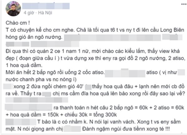 Facebook Nguyễn Quốc Lập chia sẻ trong nhóm dành cho giới trẻ câu chuyện anh dẫn người yêu lên cầu Long Biên (Hà Nội) chơi bị "chặt chém" 300.000 đồng. Anh Lập cho biết, việc xảy ra tối 15/12, vì thấy chỗ ngồi giữa cầu có view đẹp nên cả hai đã đồng ý ngồi xuống chiếu và gọi hai bắp ngô, hai cốc trà atiso và một đĩa hoa quả dầm. Đến lúc tính tiền, anh đã "té ngửa" vì giá quá đắt.