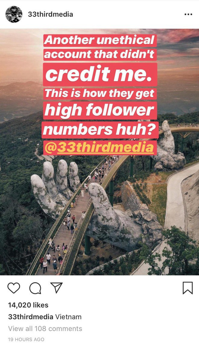 Tài khoản Instagram Wonderful Places chuyên giới thiệu những điểm đến hấp dẫn trên thế giới với 10 triệu người theo dõi, cũng đăng lại bức ảnh chụp cây cầu Vàng của Jason.