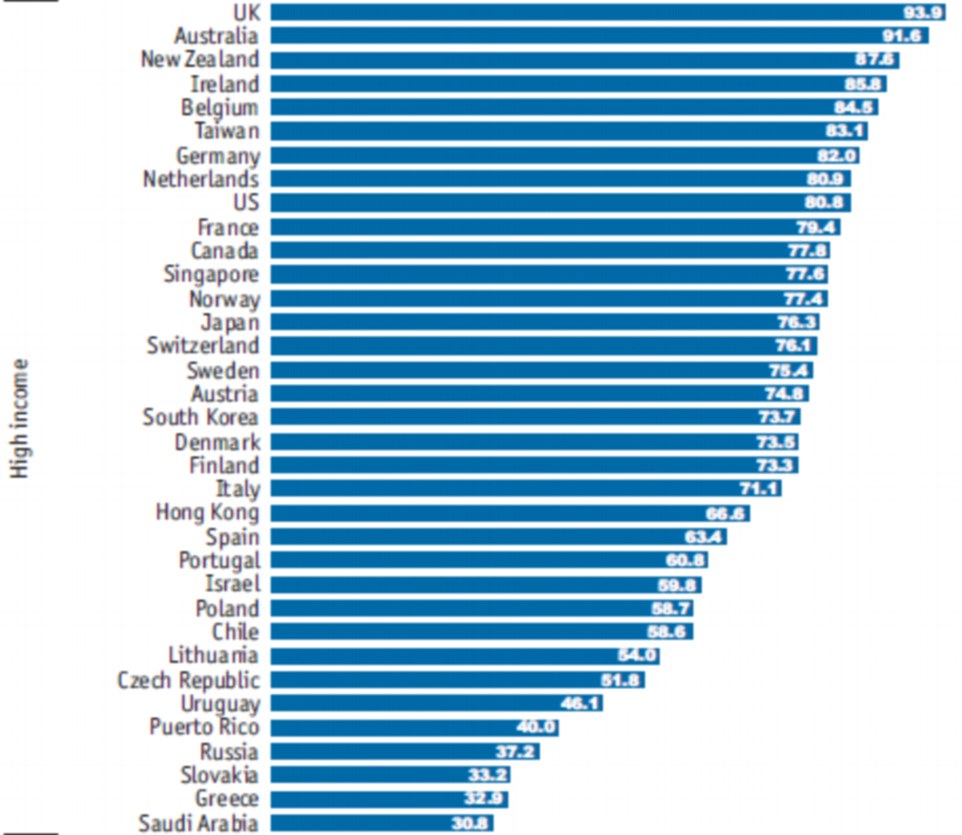 | Anh đứng đầu bảng xếp hạng chăm sóc cuối đời khi so với các nước có thu nhập cao khác trên thế giới. Saudi Arabia có điểm số thấp nhất trong danh sách này. Nguồn: EIU |