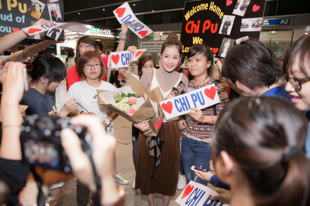 Tối 17/11, Chi Pu đáp chuyến bay đêm về Việt Nam sau chuỗi ngày hoạt động tại Hàn Quốc. Nhiều người hâm mộ đã có mặt từ sớm đề chào đón Chi Pu trở về.