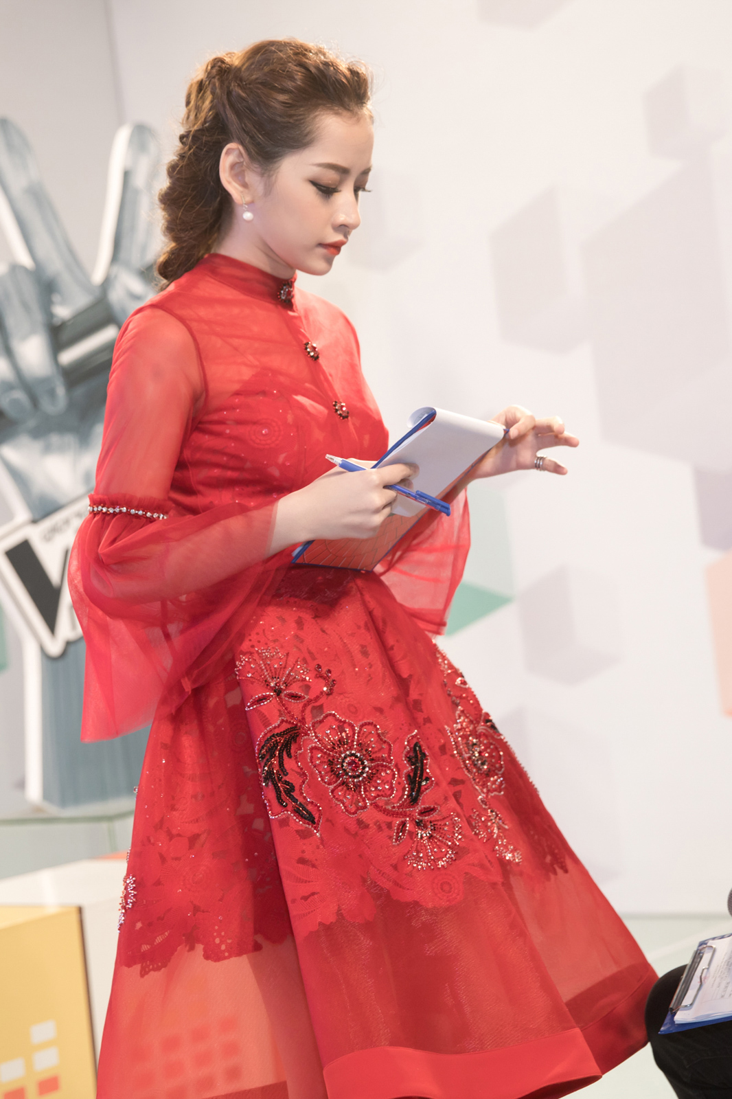 | Xuất hiện trong hậu trường, Chi Pu nổi bật với chiếc đầm xòe đỏ của NTK Đỗ Long kết hợp giày cao gót cùng màu. |