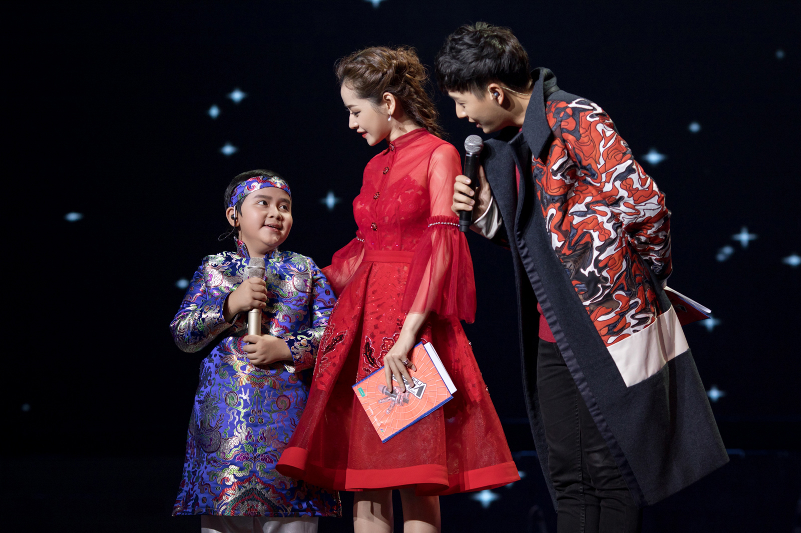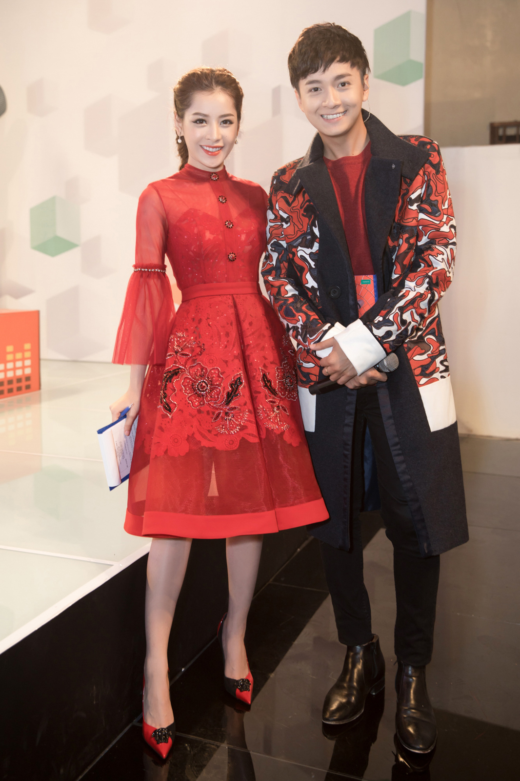 | Trong khi đó, Ngô Kiến Huy ton sur ton khi diện áo măng tô đỏ với họa tiết cầu kì. Như thường lệ, cả hai đều chỉnh sửa và tập luyện lại kịch bản MC cùng nhau trước giờ lên sóng. |