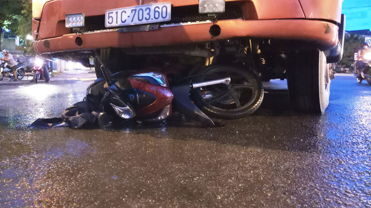 Xe máy cùng 2 vợ chồng bị xe đầu kéo cuốn vào gầm sau va chạm. Tuy nhiên, cả 2 đều may mắn không bị cán trúng, lồm cồm bò ra ngoài trong trạng thái hoảng loạn.