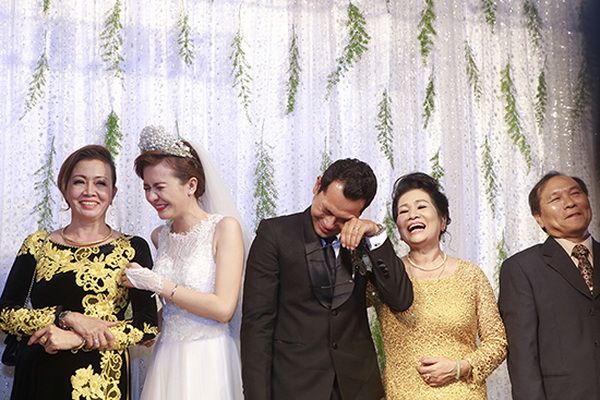 Cô dâu Ái Châu và chú rể Huỳnh Đông đã không giấu được sự xúc động và bật khóc ngay trong đám cưới.