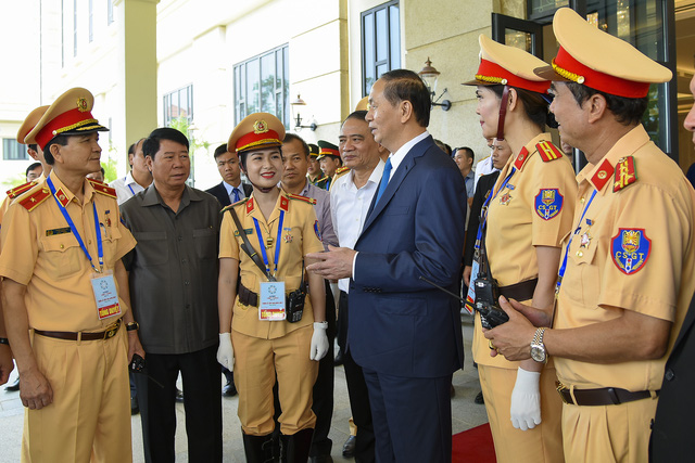 Chủ tịch nước Trần Đại Quang trao đổi với lực lượng Cảnh sát giao thông trong quá trình tổng duyệt Tuần lễ cấp cao APEC ngày 29/10. Ảnh: Báo Dân trí |
