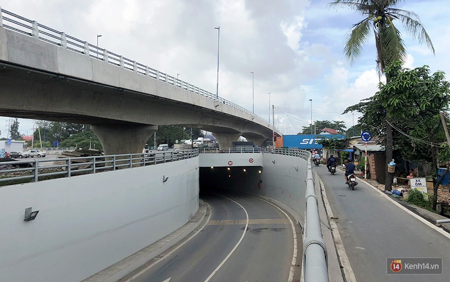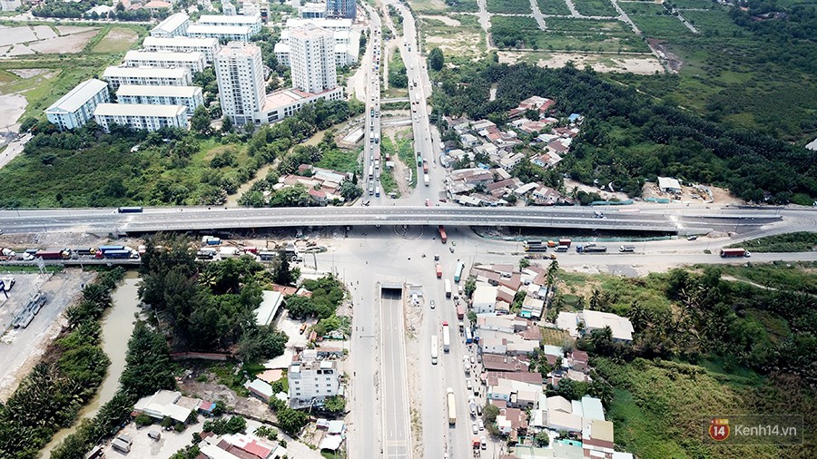 Nhìn từ cầu vượt xuống là hầm chui từ vành đai 2 về cảng Cát Lái.