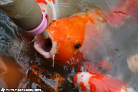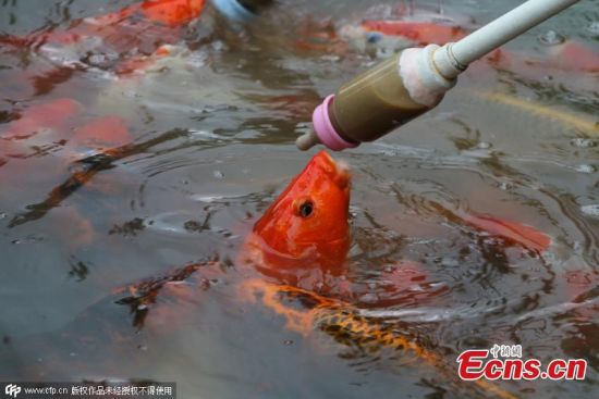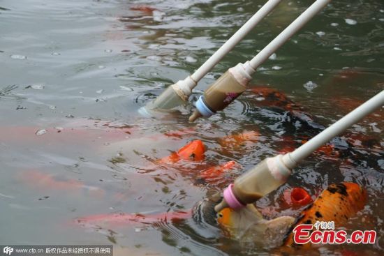 Bạn có thể cho những chú cá ăn bằng bình sữa nếu đến với một công viên tại Hợp Phì, tỉnh An Huy, Trung Quốc.