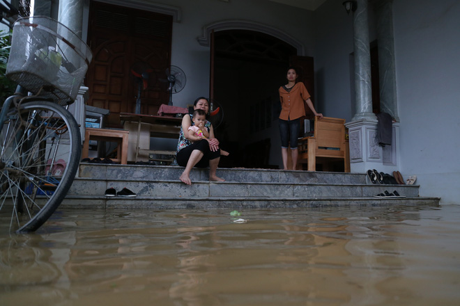 | "Hôm trước nước ngập hết bậc tam cấp này, nay nó rút xuống được một chút. Gia đình tôi ở lại để giữ đồ đạc vì khi lũ về không di tản kịp", một người dân thôn Bùi Xá chia sẻ. |