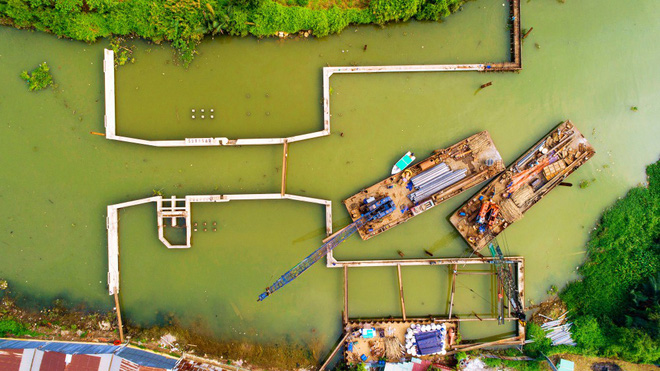 Toàn cảnh cống Tân Thuận. Khung vây được đào sâu xuống lòng sông đến 20m.