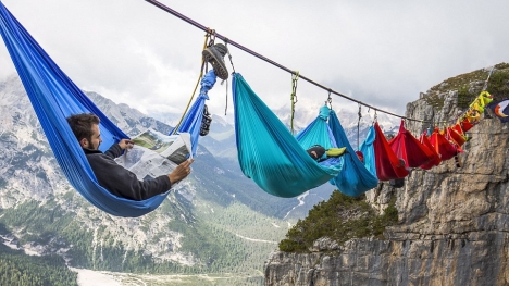 Một nhóm những vận động viên mạo hiểm tại Ý đã mắc những chiếc võng qua khe núi sâu Monte Piana thuộc dãy Dolomites (Ý) để nghỉ ngơi đã khiến nhiều người xem không khỏi hoảng hốt.