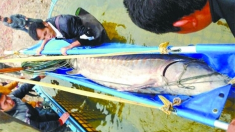 Cá tầm nặng 350kg, dài 3,3m được xem là con cá tầm lớn nhất Trung Quốc trong vòng 20 năm trở lại đây đã bị một ngư dân Trung Quốc tóm gọn.