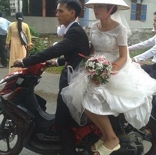 Cô dâu mặc váy trắng nhưng không đi giày cao gót, đội nón trắng và không ngồi trên xe hoa mà thay bằng xe máy. Cô dâu đi dôi dép lê màu trắng ngồi sau chú rể về nhà chồng trong ngày cưới.