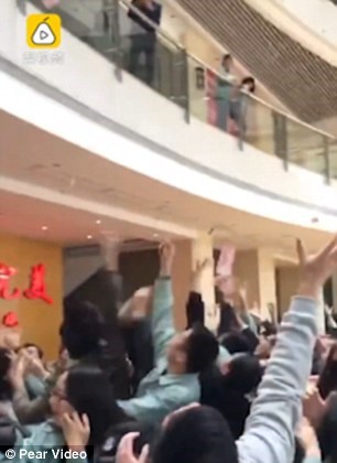Thay vì mừng tuổi theo cách truyền thống, một ông chủ người Trung Quốc ở thành phố Phật Sơn (Quảng Đông) đã đứng trên lan can tầng 2 và tung tập tiền mệnh giá 100 nhân dân tệ xuống cho nhân viên bắt.