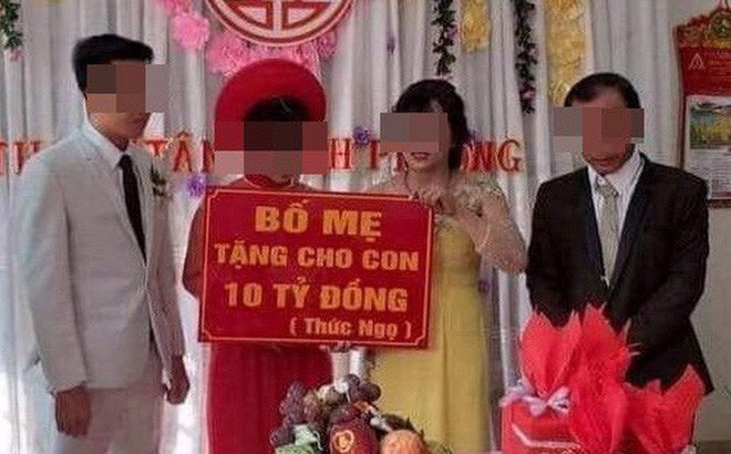 Trước đó, trên mạng xã hội chia sẻ bức ảnh cha mẹ trao quà cưới cho chú rể, cô dâu với tấm biển 10 tỷ đồng. Cảnh trao quà cưới độc nhất vô nhị này được ghi lại tại xã Lộc Tấn, huyện Lộc Ninh, tỉnh Bình Phước hôm 7/10.