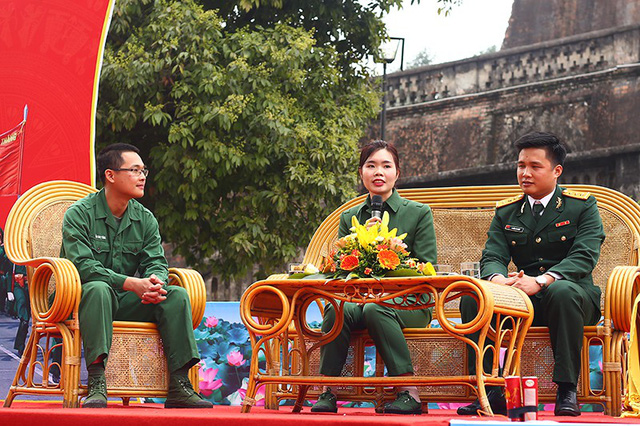 | Là một trong những bóng hồng hiếm hoi tự nguyện nộp đơn xin lên đường nhập ngũ, Thu Trà được tham gia buổi giao lưu cùng các đồng chí quân nhân chuyên nghiệp và chiến sĩ xuất ngũ tiêu biểu. Ảnh Dân Trí |