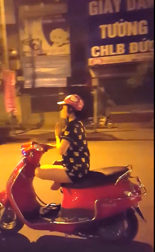 Trước đó, cộng đồng mạng cũng xôn xao trước hành động của một cô gái, khi cô gái này vừa điều khiển xe máy bằng 1 tay, vừa khoanh tròn chân trên yên xe còn miệng thì liên tục lẩm nhẩm, cô gái cứ giữ tư thế đó và đi cả quãng đường khá dài.