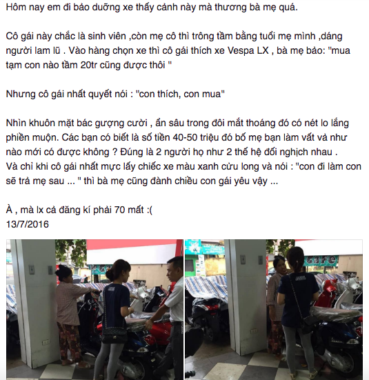 Theo chủ nhân câu chuyện chia sẻ, thì sự việc diễn ra tại một cửa hàng bán xe máy. Người mẹ với vẻ ngoài khá lam lũ, vất vả đưa cô con gái mình tới mua xe, nhưng trong lúc bà mẹ bảo con mua tạm chiếc xe nào đó tầm 20 triệu để đi thì cô gái nhất quyết lấy chiếc xe Vespa LX có giá hơn cả vài chục triệu.