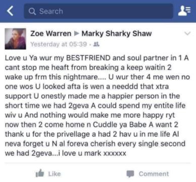 Zoe Warren, 20 tuổi đã nói về "cơn ác mộng" của mình khi người bạn trai qua đời trên mạng xã hội bằng những lời lẽ đau thương: "Em yêu anh, người bạn thân nhất của em, và cũng là tri kỷ của em. Trái tim em thật sự tan vỡ và em luôn chờ đợi để tỉnh dậy từ cơn ác mộng này. Anh luôn sẵn sàng ở bên cạnh em, anh luôn chăm sóc khi em cần sự ủng hộ nhất. Em có thể dành cả cuộc đời này cho anh và không có thứ gì khiến em hạnh phúc hơn là mỗi ngày được trở về nhà ôm lấy anh, anh yêu à".