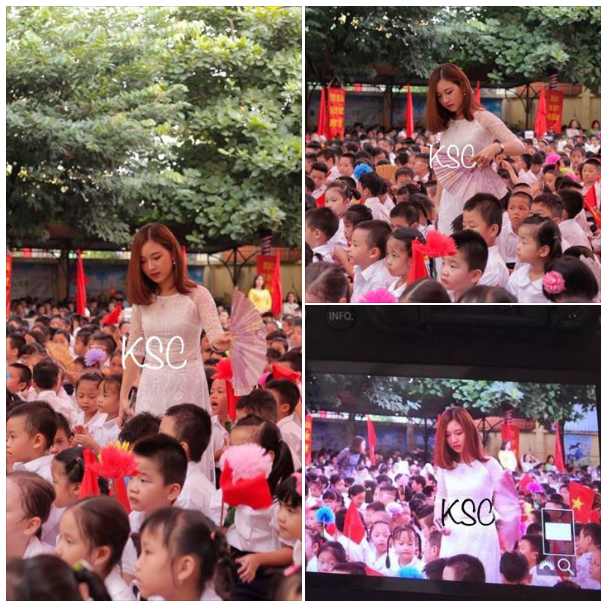Trong ảnh, cô giáo 9X nổi bật với ngoại hình xinh đẹp và ghi điểm nhờ hànhđộng quạt mát cho các em học sinh khi đang ngồi theo dõi lễ khai giảng năm học mới.