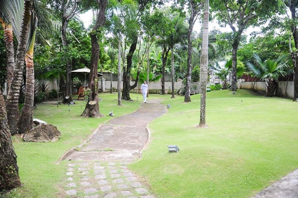 | Sân vườn rộng thênh thang với lối đi đá và hai bên trải thảm cỏ cùng cây cối mát rượi |