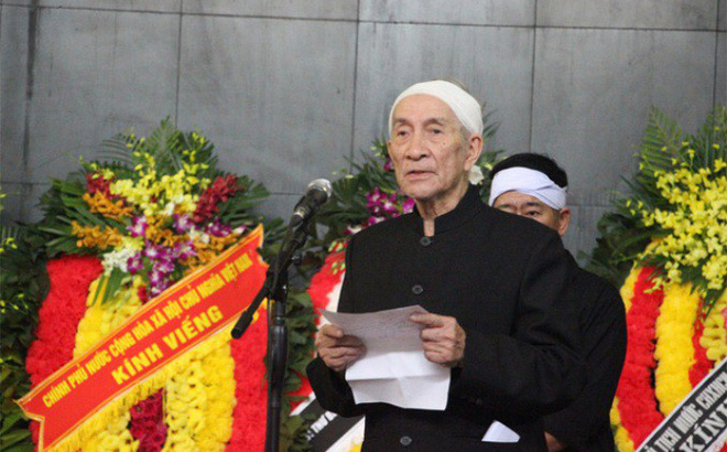 | Ông Trịnh Lương phát biểu cảm tạ tại lễ tang cụ Hoàng Thị Minh Hồ. |