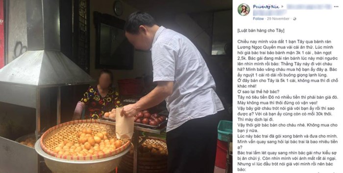 Theo thông tin từ báo Kiến Thức, vụ việc được chủ tài khoản P.H. chia sẻ trên trang cá nhân vào ngày 29/11 với nội dung như sau: Cô đưa một người bạn nước ngoài đến một cửa hàng trên phố Lương Ngọc Quyến (Hoàn Kiếm, Hà Nội) mua một vài chiếc bánh rán để ăn thử. Bình thường, cửa hàng bán 3.000 đồng/chiếc bánh rán mặn, bánh ngọt là 2.500 đồng/chiếc. Tuy nhiên, khi biết người cần mua bánh là người "bạn Tây" chứ không phải cô, chủ tiệm bánh rán đã nâng giá lên 5.000 đồng/chiếc với một câu nói: "Ở đây bán cho Tây là 5.000 đồng/cái, không mua thì đi chỗ khác!".