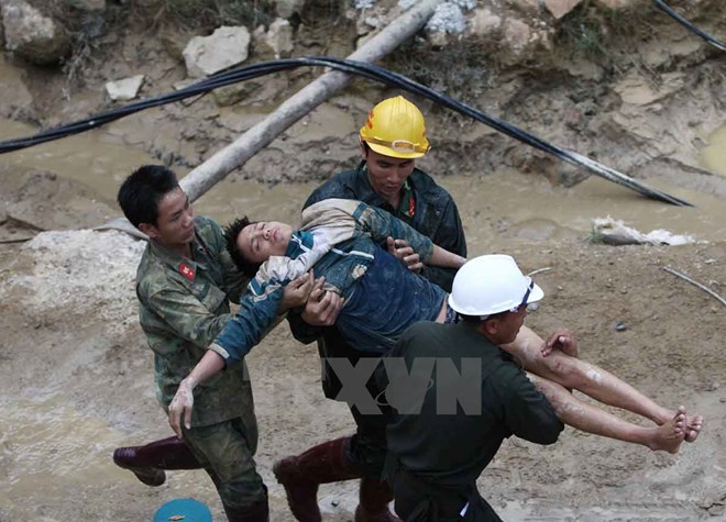 Các chiến sỹ công binh đưa nạn nhân vụ sập hầm ra ngoài (Ảnh: TTXVN)