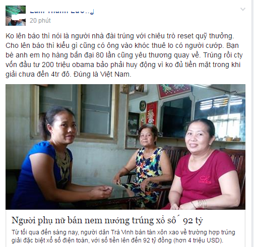 Trước thông tin hình ảnh người phụ nữ Trà Vinh trúng thưởng giải đặc biệt 92 tỷ đồng xổ số kiểu Mỹ đang tràn ngập các mặt báo, nhiều quan điểm đang tỏ ra lo ngại về sự an toàn và hệ lụy kéo theo của câu chuyện "hậu độc đắc".