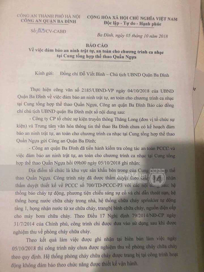 "Công ty CP tổ chức sự kiện truyền thông Thăng Long (đơn vị tổ chức sự kiện) và Trung tâm Văn hóa Thông tin thể thao Ba Đình chưa có kế hoạch đảm bảo an ninh trật tự, an toàn cho chương trình ca nhạc tại Cung tổng hợp thể thao Quần Ngựa gửi Công an quận Ba Đình.