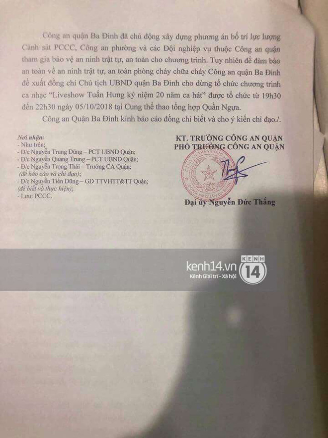 Để đảm bảo an toàn về an ninh trật tự, an toàn PCCC, công an quận Ba Đình đã đề xuất cho tạm dừng tổ chức chương trình ca nhạc kỷ niệm 20 năm ca hát của ca sĩ Tuấn Hưng được tổ chức từ 19h30 đến 22h30 ngày 5/10 tại Cung thể thao tổng hợp Quần Ngựa" - công văn Công an Quận Ba Đình nêu rõ.